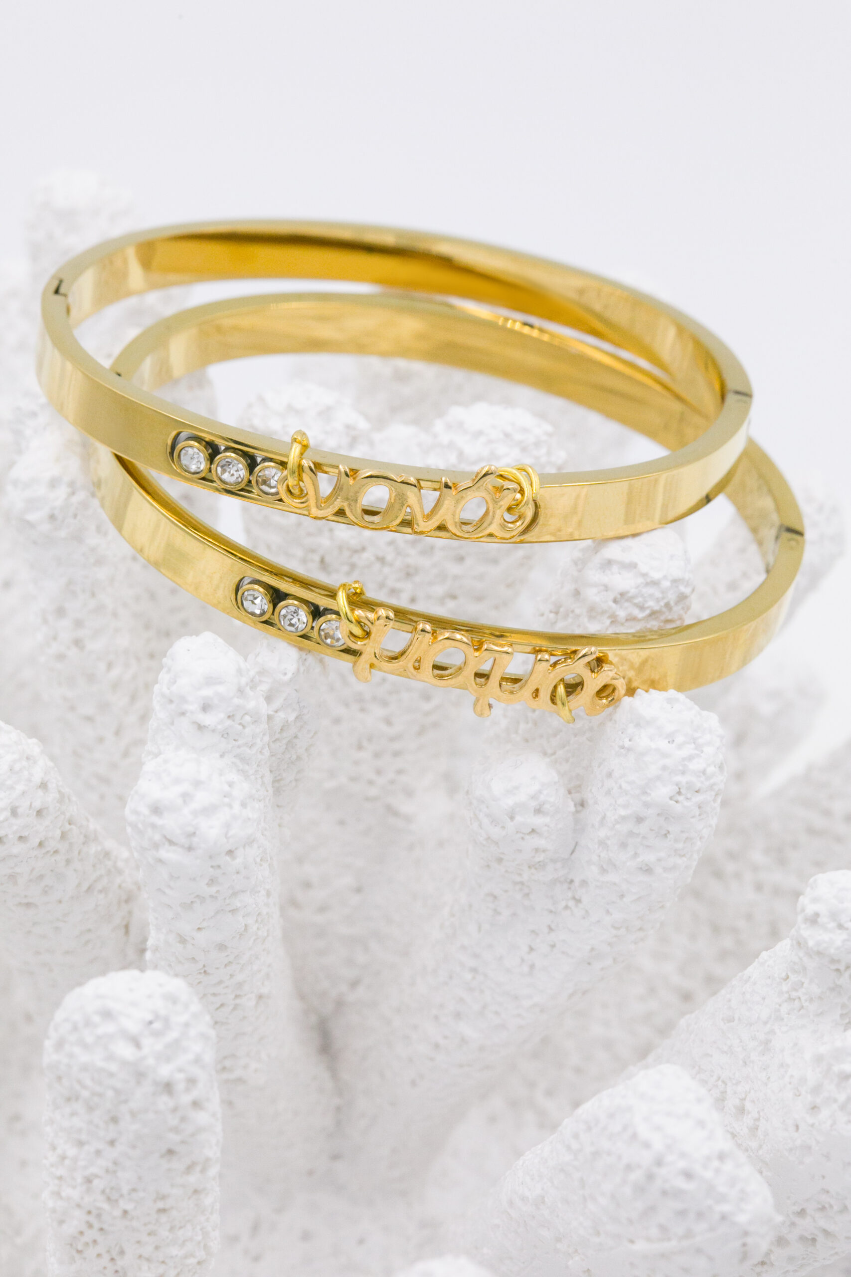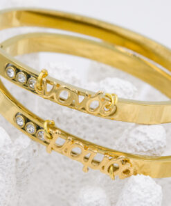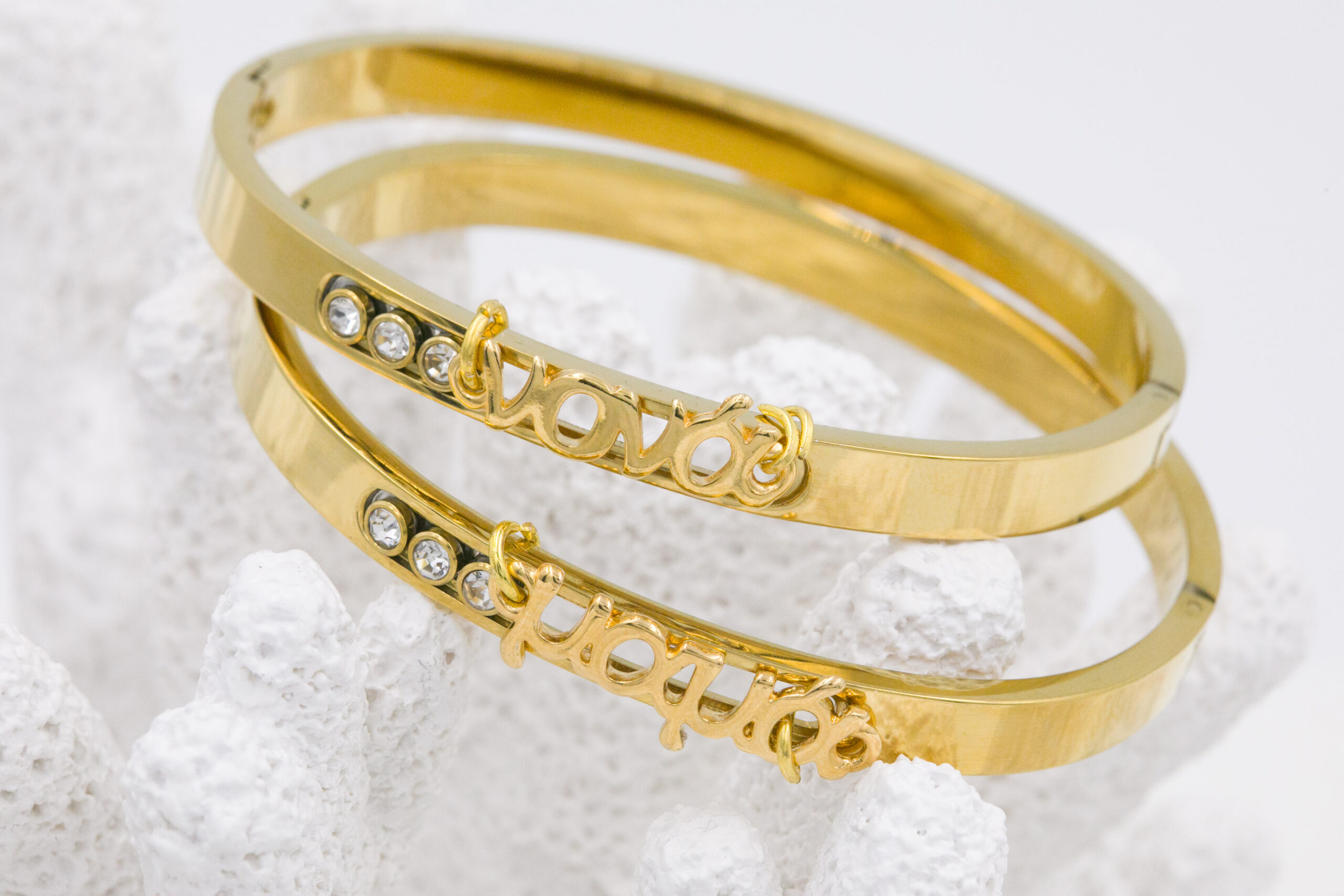 Stainless steel bracelet χρυσή απόχρωση και στρας με επιχρυσωμένο μαμά, νονά και γιαγιά. Οι φωτογραφίες έχουν υποστεί επεξεργασία και τα χρώματα ίσως να διαφέρουν λίγο στην πραγματικότητα. Η Τιμή αφορά συσκευασία 2 τεμαχίων.
