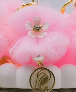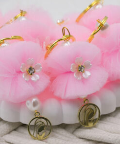 Μαρτυρικό μπρελόκ με πον πον ροζ τούλι, λουλούδι λευκό, πέρλες και Παναγίτσα. Οι φωτογραφίες έχουν υποστεί επεξεργασία και τα χρώματα ίσως να διαφέρουν λίγο στην πραγματικότητα. Η τιμή αφορά συσκευασία 50 τεμαχίων.