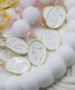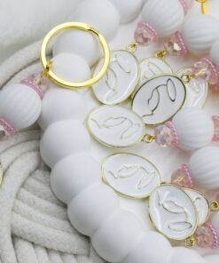 Μαρτυρικό μπρελόκ με λευκή χάντρα, ροζ κρύσταλλα και Παναγίτσα με λευκό σμάλτο. Οι φωτογραφίες έχουν υποστεί επεξεργασία και τα χρώματα ίσως να διαφέρουν λίγο στην πραγματικότητα. Η τιμή αφορά συσκευασία 50 τεμαχίων.