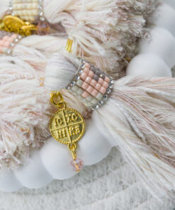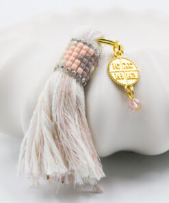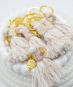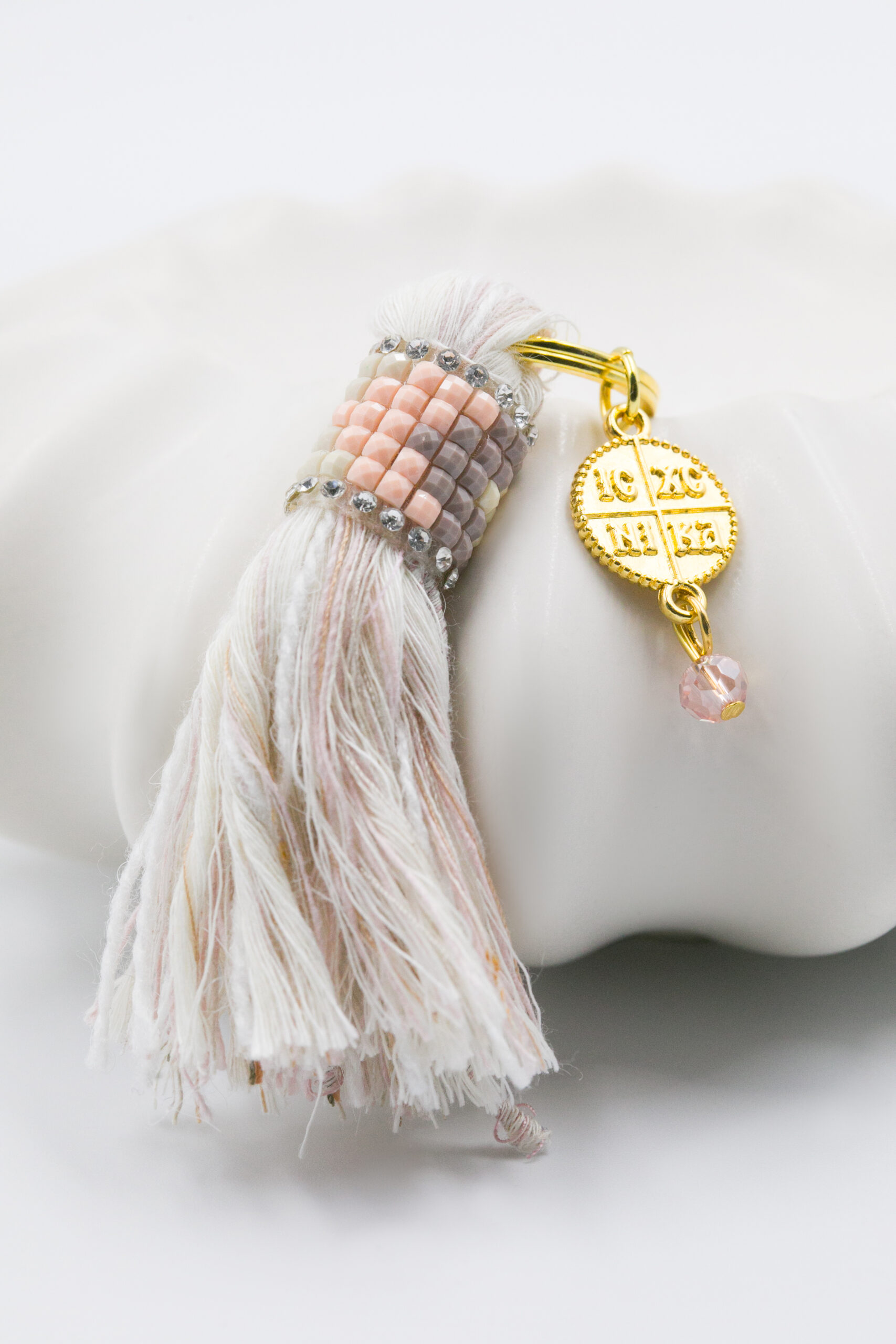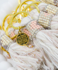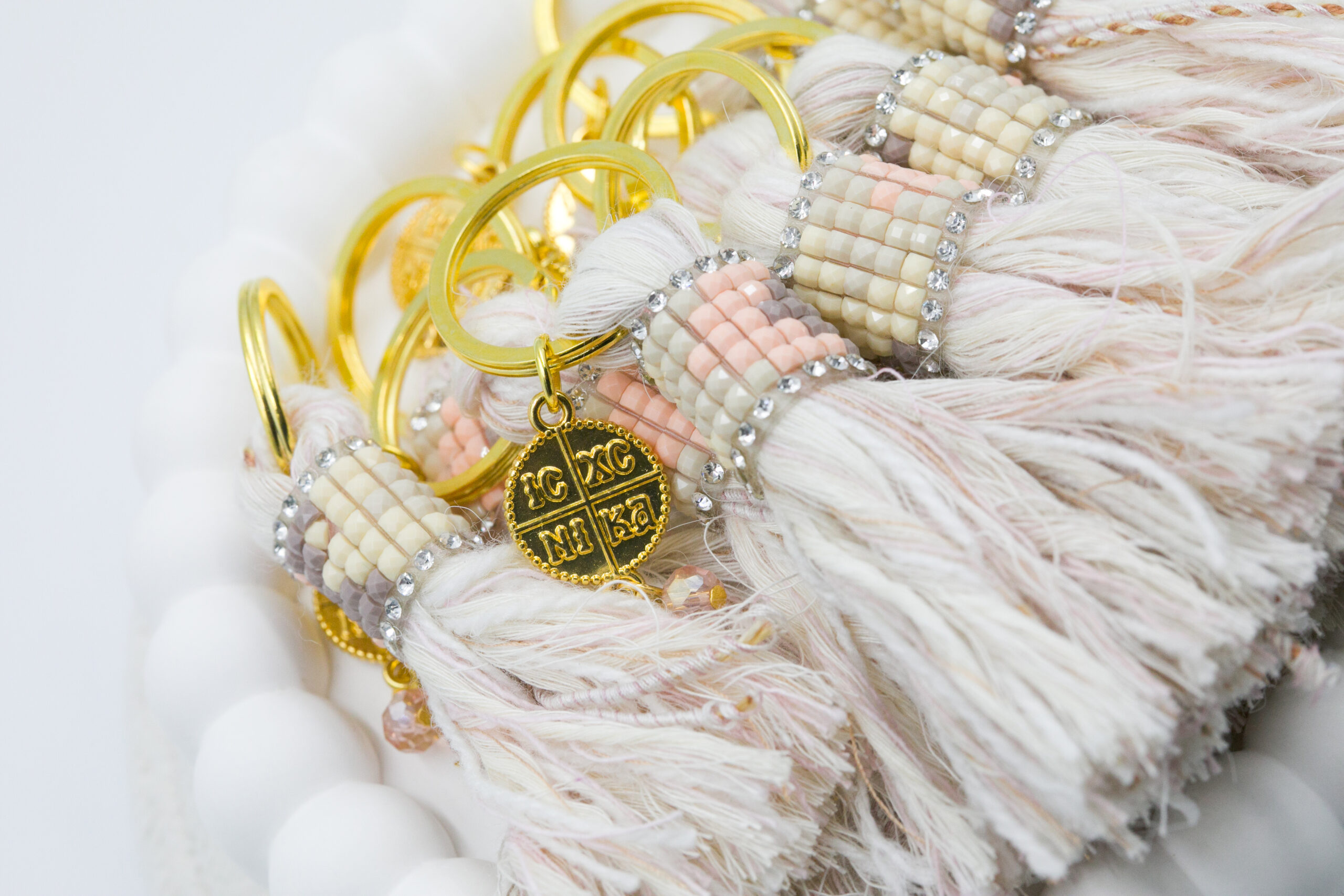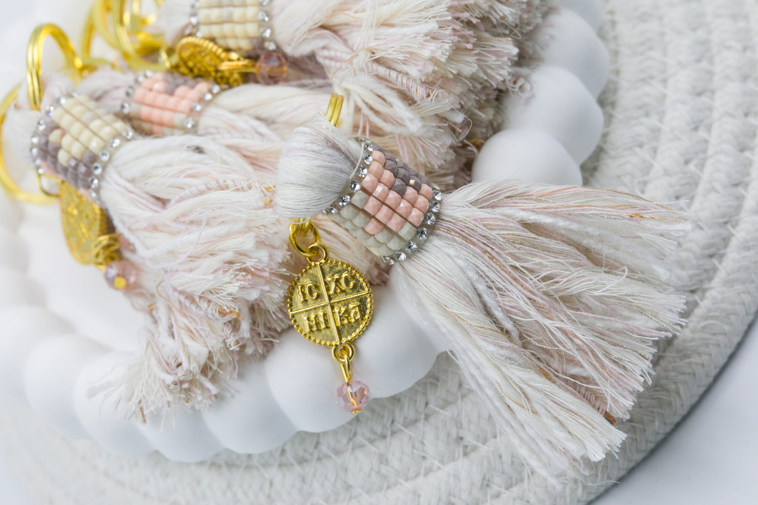 Μαρτυρικό μπρελόκ χειροποίητη φούντα σε χρώμα εκρού Σ. μήλο κωνσταντινάτο και κρύσταλλο ροζ. Οι φωτογραφίες έχουν υποστεί επεξεργασία και τα χρώματα ίσως να διαφέρουν λίγο στην πραγματικότητα. Η τιμή αφορά συσκευασία 50 τεμαχίων.