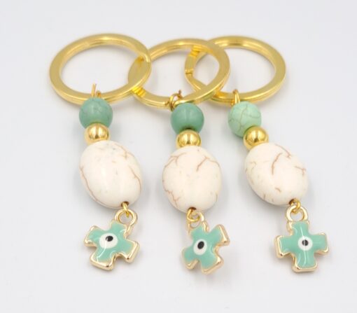 Μαρτυρικό μπρελόκ με χαολίτη λευκό και βεραμάν, σταυρό με σμάλτο μάτι. Οι φωτογραφίες έχουν υποστεί επεξεργασία και τα χρώματα ίσως να διαφέρουν λίγο στην πραγματικότητα. Η τιμή αφορά συσκευασία 50 τεμαχίων.