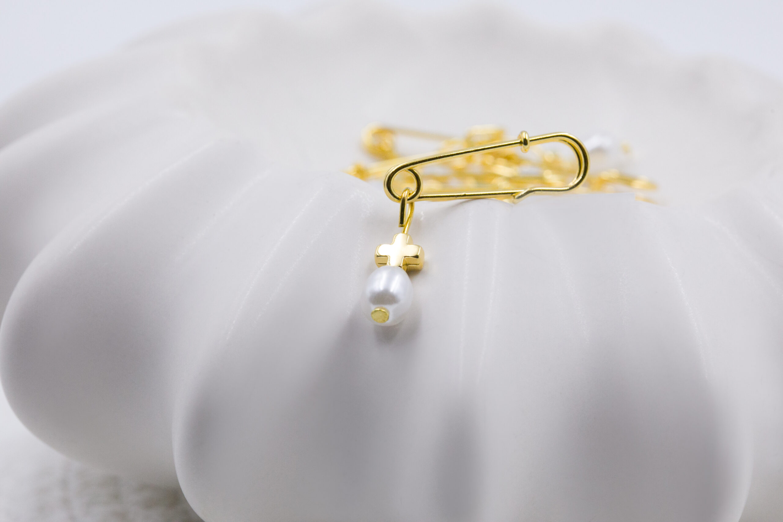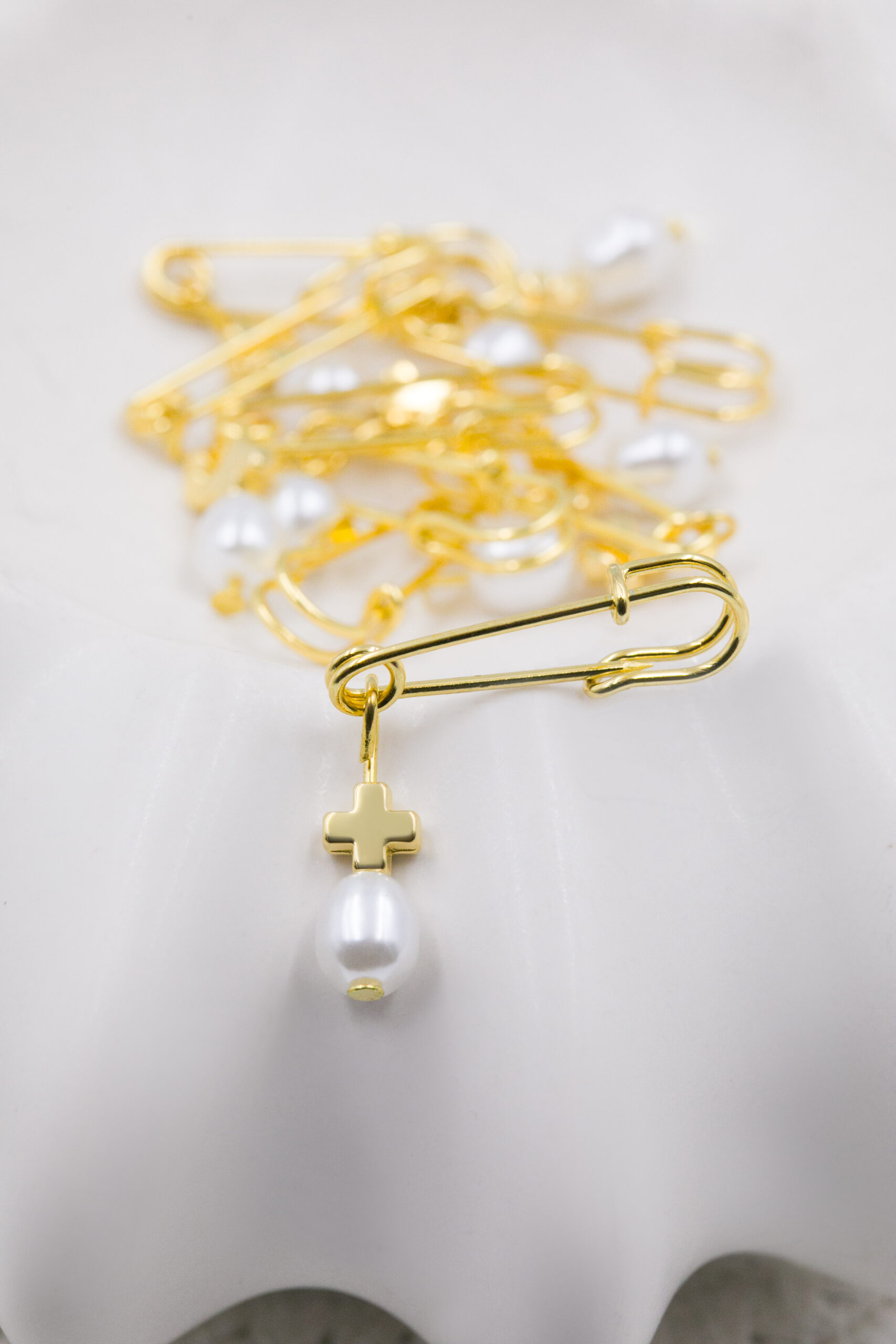 Μαρτυρικό καρφίτσα με πέρλα και επιχρυσωμένο σταυρό. Οι φωτογραφίες έχουν υποστεί επεξεργασία και τα χρώματα ίσως να διαφέρουν λίγο στην πραγματικότητα. Η τιμή αφορά συσκευασία 50 τεμαχίων.