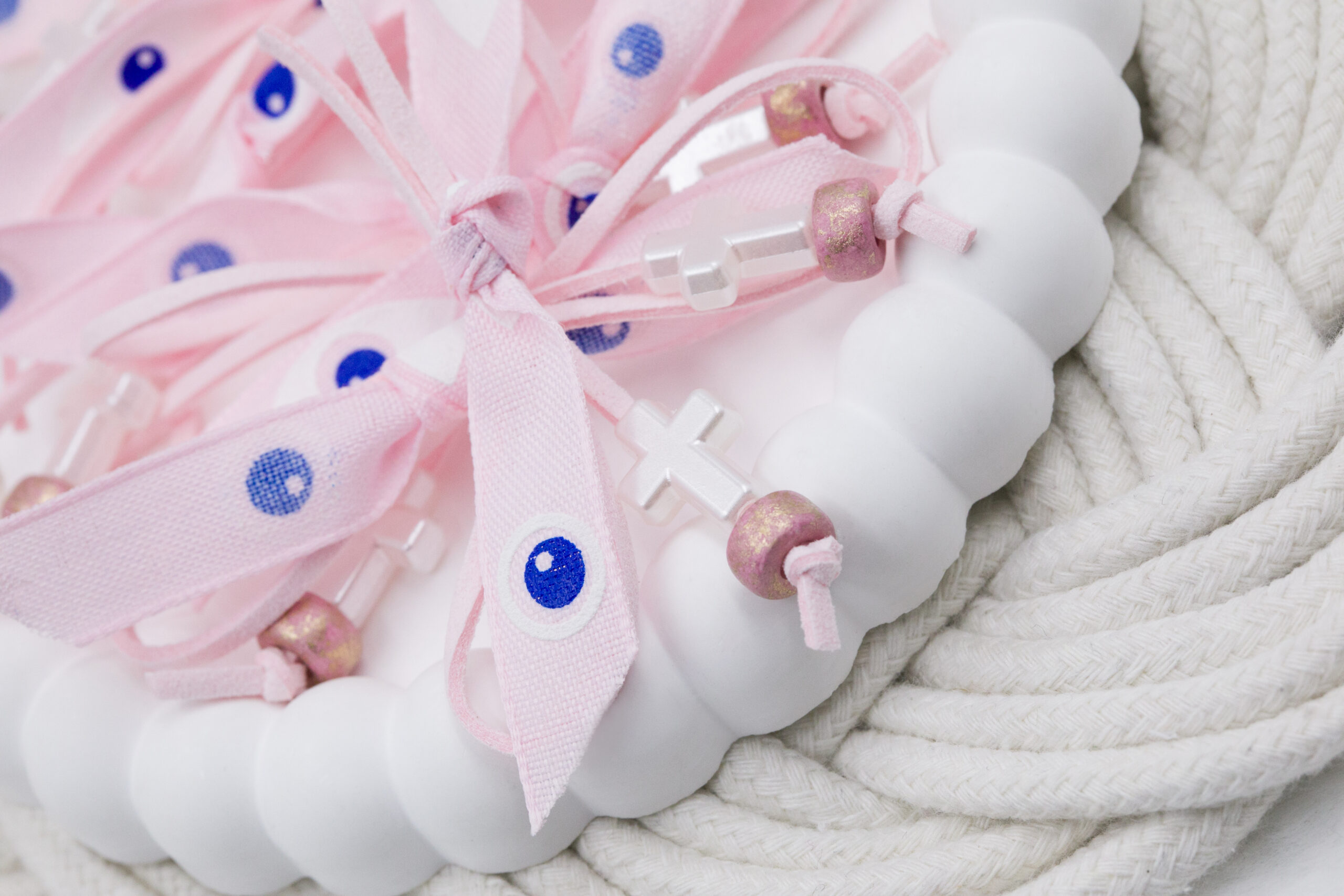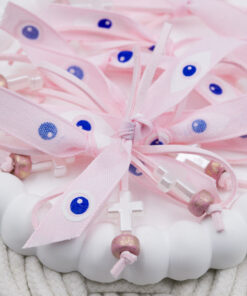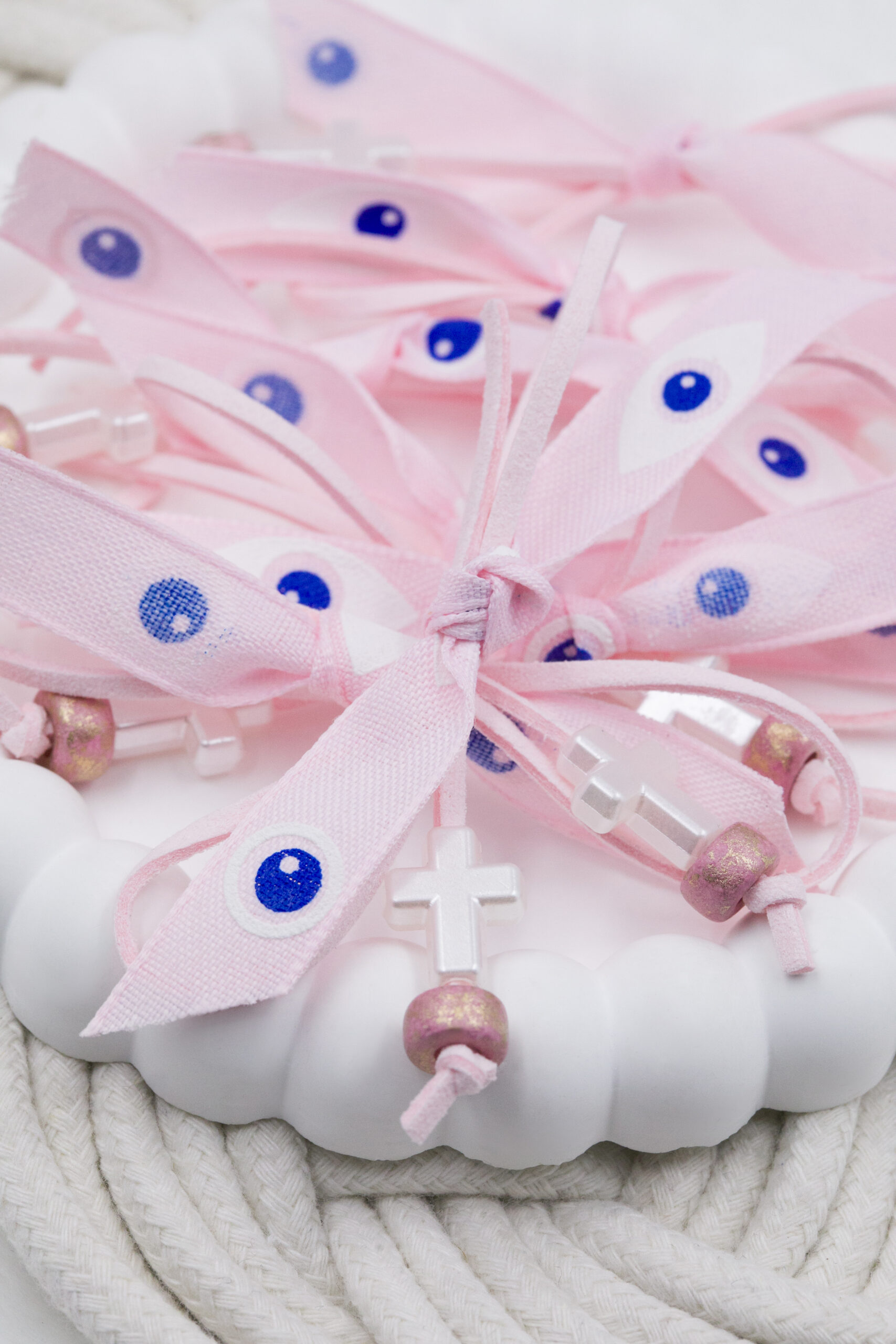 Μαρτυρικό πέτου, ροζ σουέτ κορδόνι, ακρυλικός περλέ σταυρός κεραμική χάντρα και κορδέλα με σχήμα μάτι. Οι φωτογραφίες έχουν υποστεί επεξεργασία και τα χρώματα ίσως να διαφέρουν λίγο στην πραγματικότητα. Η τιμή αφορά συσκευασία 50 τεμαχίων.