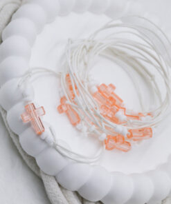 Μαρτυρικό βραχιόλι με λευκό κορδόνι, διάφανο σομόν ακρυλικό σταυρό. Οι φωτογραφίες έχουν υποστεί επεξεργασία και τα χρώματα ίσως να διαφέρουν λίγο στην πραγματικότητα. Η τιμή αφορά συσκευασία 50 τεμαχίων.