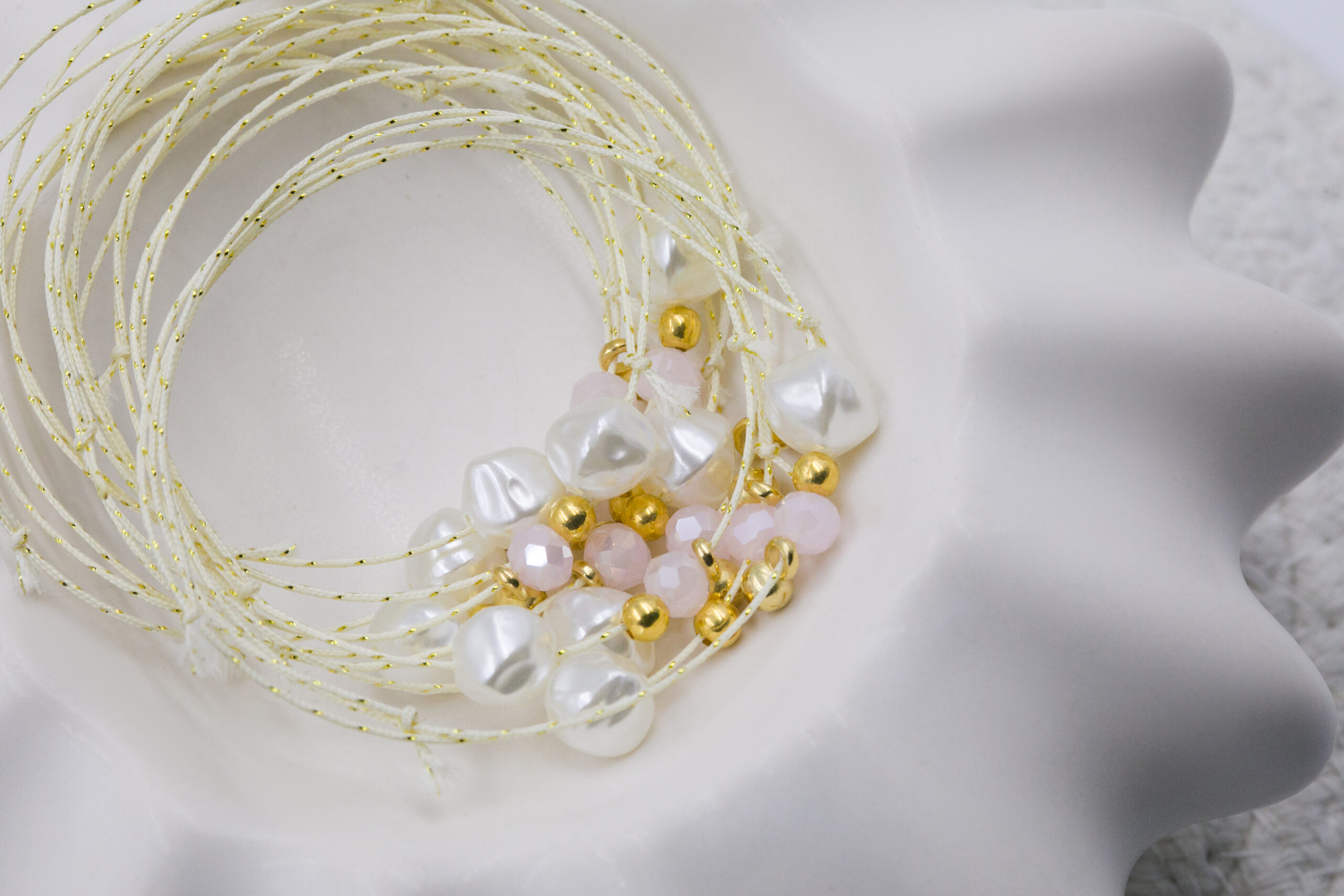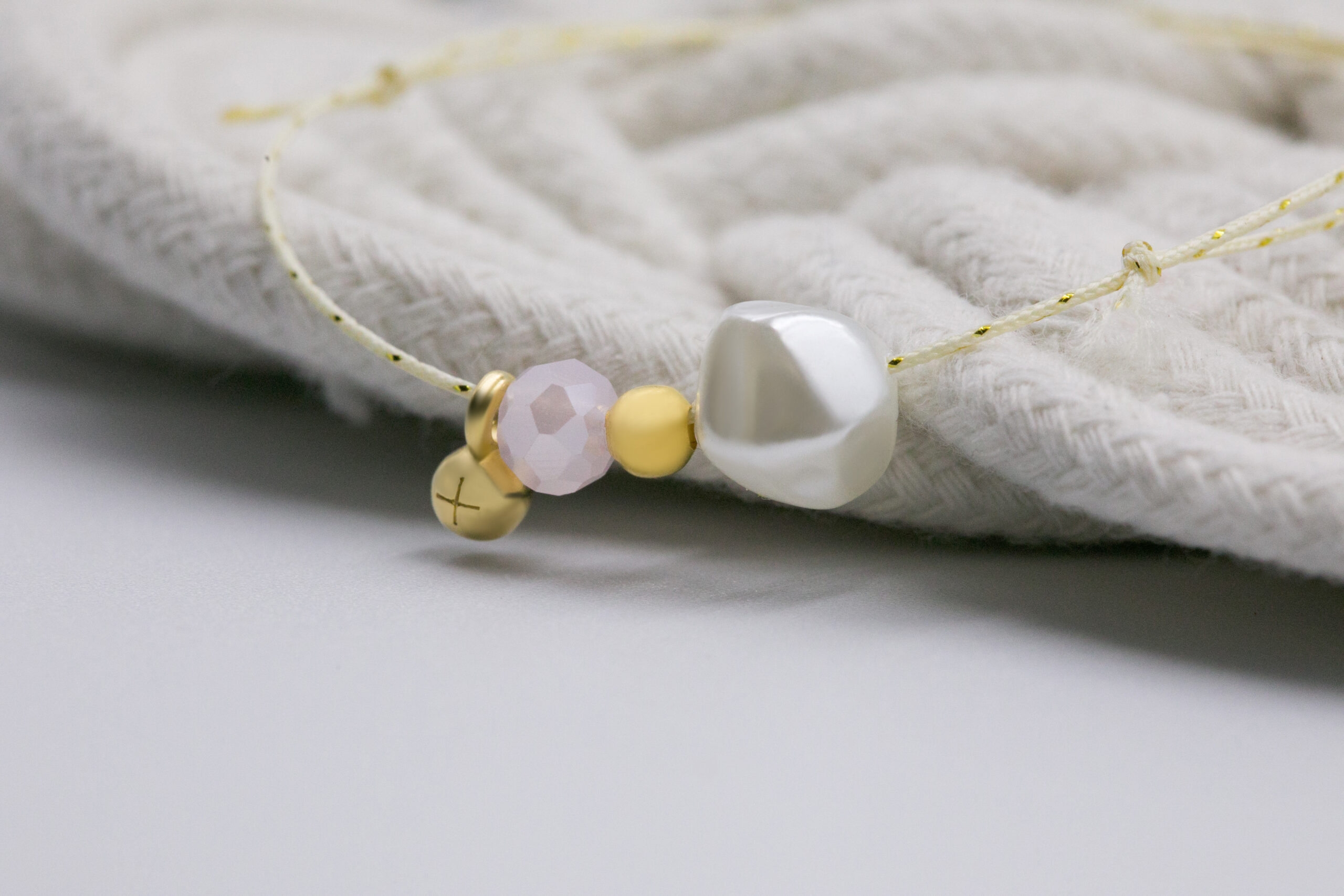 Μαρτυρικό βραχιόλι εκρού κορδόνι πέρλα κρύσταλλο ροζ και επιχρυσωμένος σταυρός. Οι φωτογραφίες έχουν υποστεί επεξεργασία και τα χρώματα ίσως να διαφέρουν λίγο στην πραγματικότητα. Η τιμή αφορά συσκευασία 50 τεμαχίων.