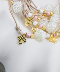 Μαρτυρικό βραχιόλι δέρμα μπεζ, πέρλα, χάντρες λευκές σ. μήλο και επιχρυσωμένος σταυρός. Οι φωτογραφίες έχουν υποστεί επεξεργασία και τα χρώματα ίσως να διαφέρουν λίγο στην πραγματικότητα. Η τιμή αφορά συσκευασία 50 τεμαχίων.