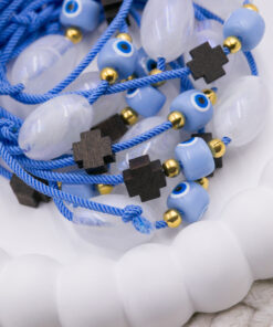 Μαρτυρικό βραχιόλι, στριφτό κορδόνι, γαλάζιο μάτι, χάντρα με νερά και ξύλινος καφέ σταυρός. Οι φωτογραφίες έχουν υποστεί επεξεργασία και τα χρώματα ίσως να διαφέρουν λίγο στην πραγματικότητα. Η τιμή αφορά συσκευασία 50 τεμαχίων.