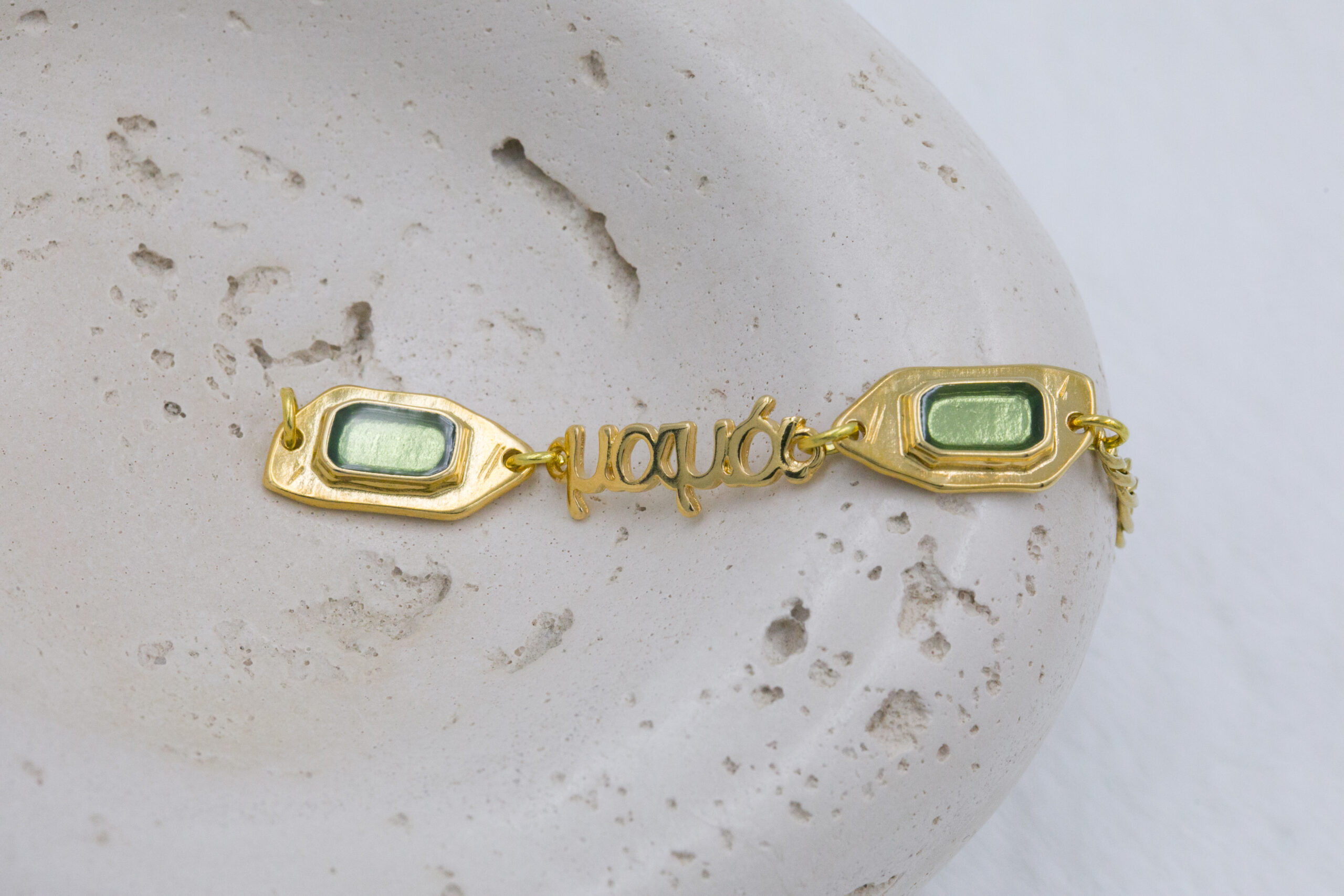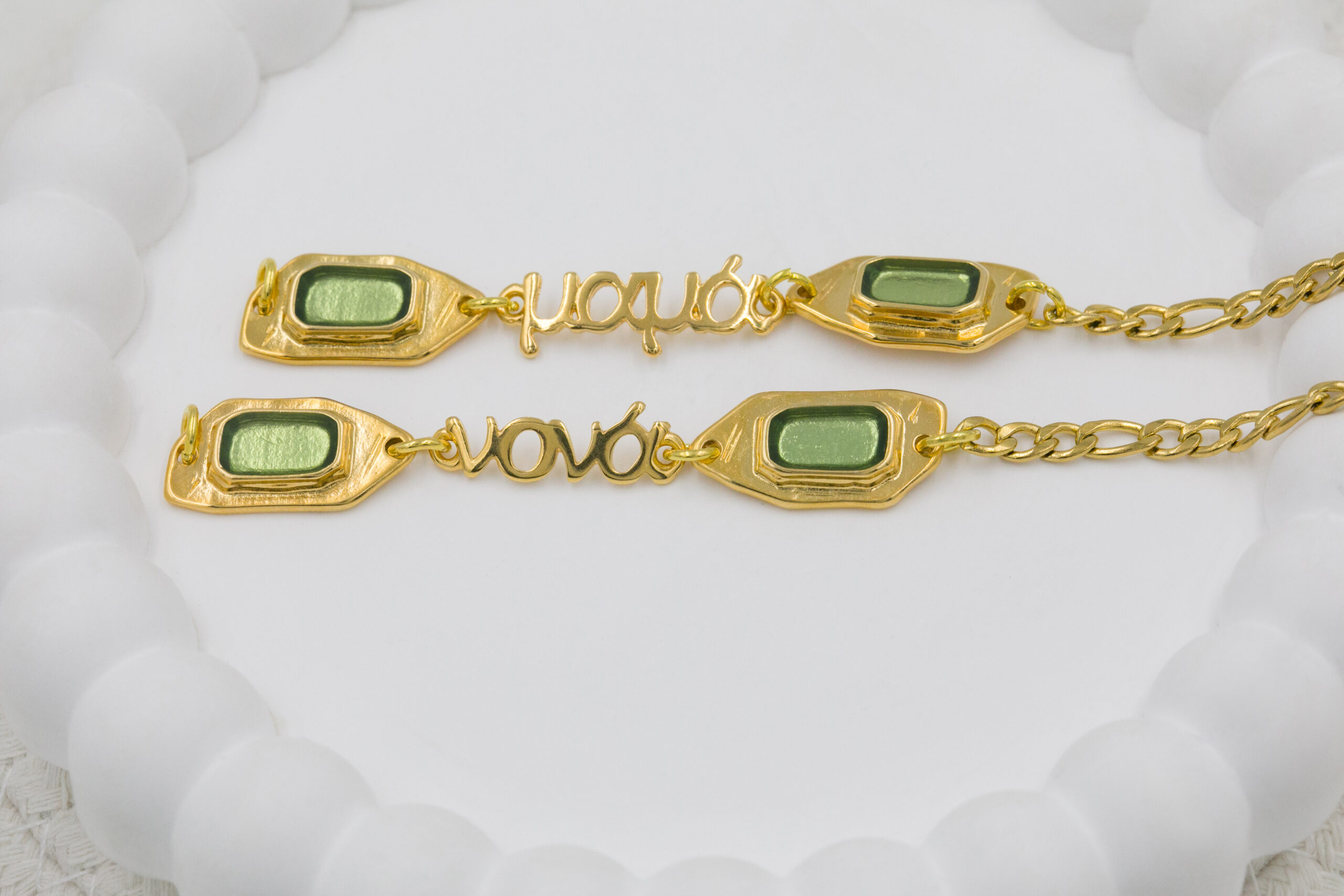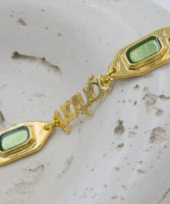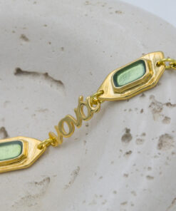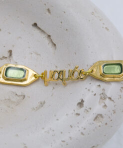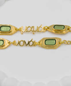 Βραχιόλι με επιχρυσωμένα μοτιφ σε χρυσή και πράσινη απόχρωση και επιχρυσωμένο μαμά, νονά και γιαγιά. Οι φωτογραφίες έχουν υποστεί επεξεργασία και τα χρώματα ίσως να διαφέρουν λίγο στην πραγματικότητα. Η Τιμή αφορά συσκευασία 2 τεμαχίων.