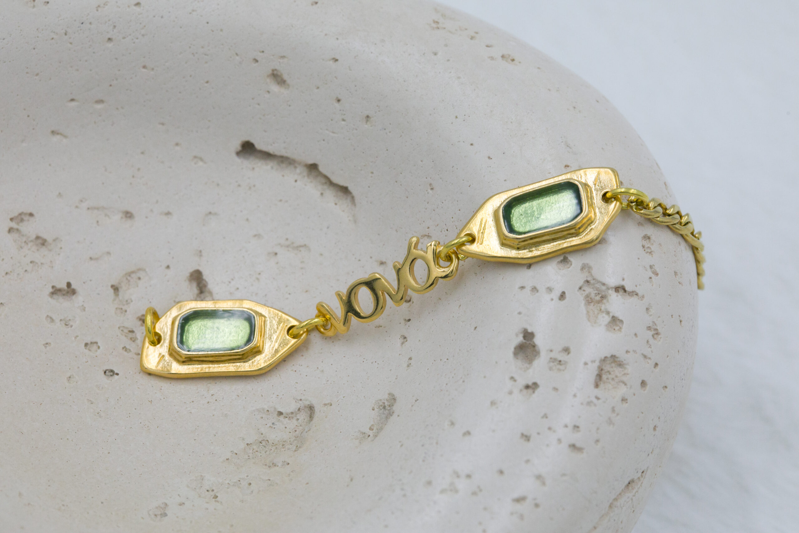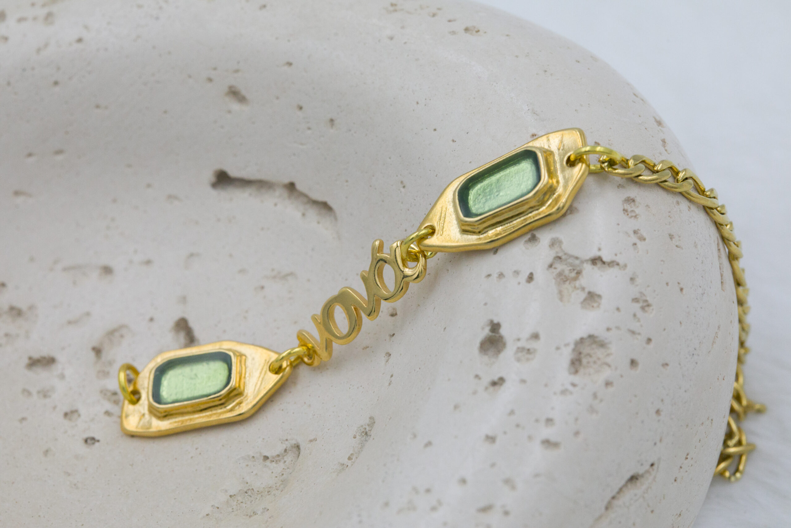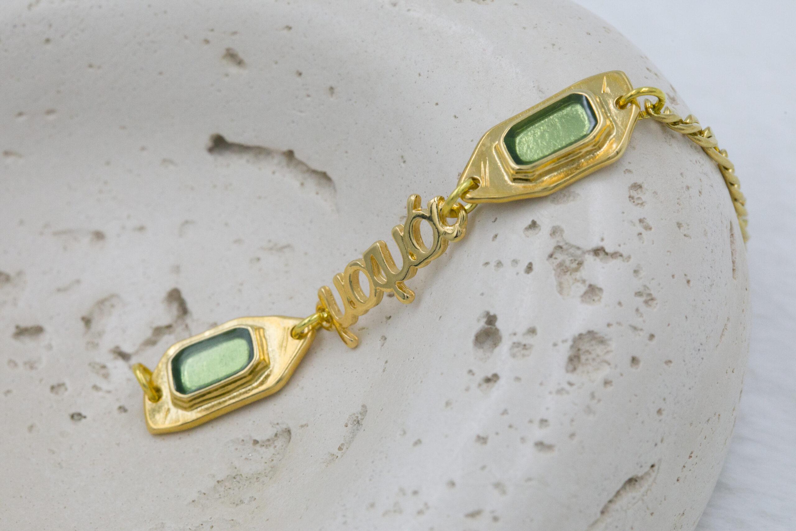 Βραχιόλι με επιχρυσωμένα μοτιφ σε χρυσή και πράσινη απόχρωση και επιχρυσωμένο μαμά, νονά και γιαγιά. Οι φωτογραφίες έχουν υποστεί επεξεργασία και τα χρώματα ίσως να διαφέρουν λίγο στην πραγματικότητα. Η Τιμή αφορά συσκευασία 2 τεμαχίων.