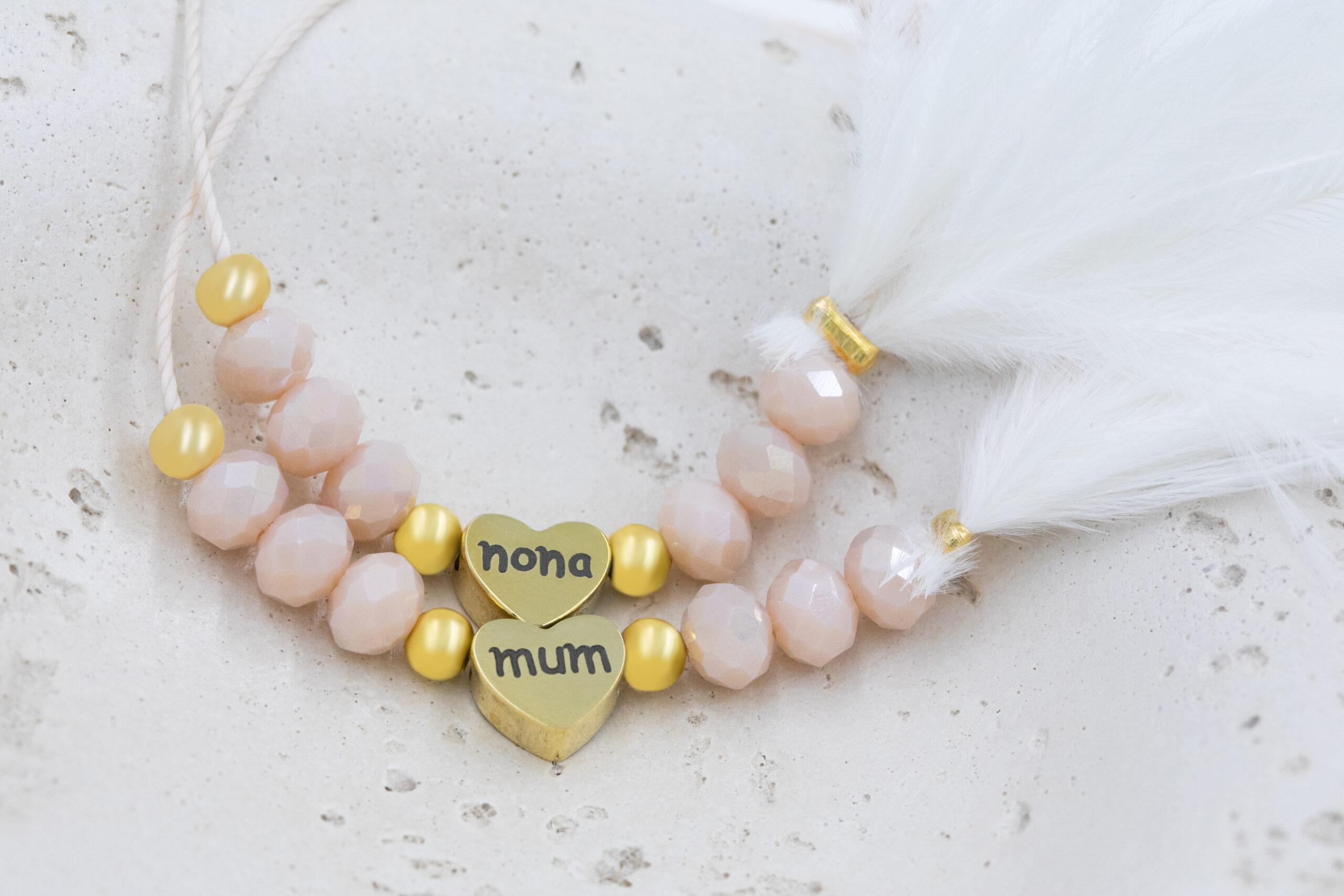 Βραχιόλι με κρύσταλλα σε χρώμα μπεζ, καρδιά μαμά και νονά με λευκό φτερό. Οι φωτογραφίες έχουν υποστεί επεξεργασία και τα χρώματα ίσως να διαφέρουν λίγο στην πραγματικότητα. Η Τιμή αφορά συσκευασία 2 τεμαχίων.
