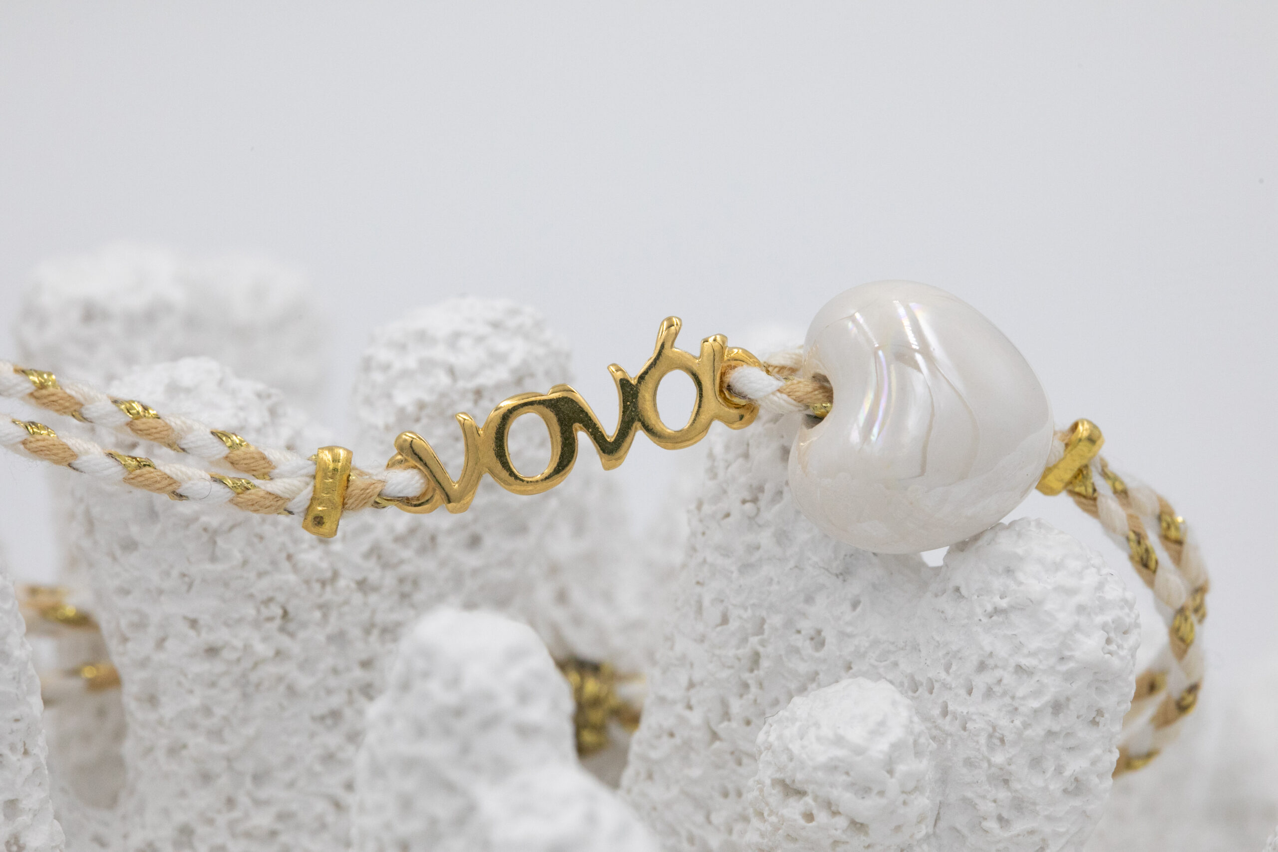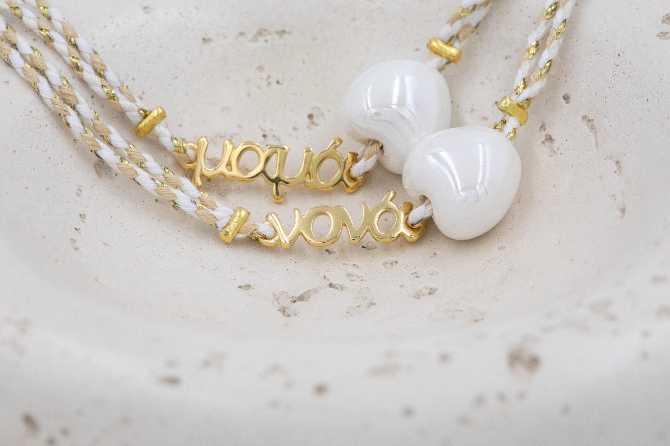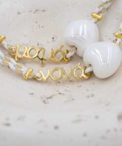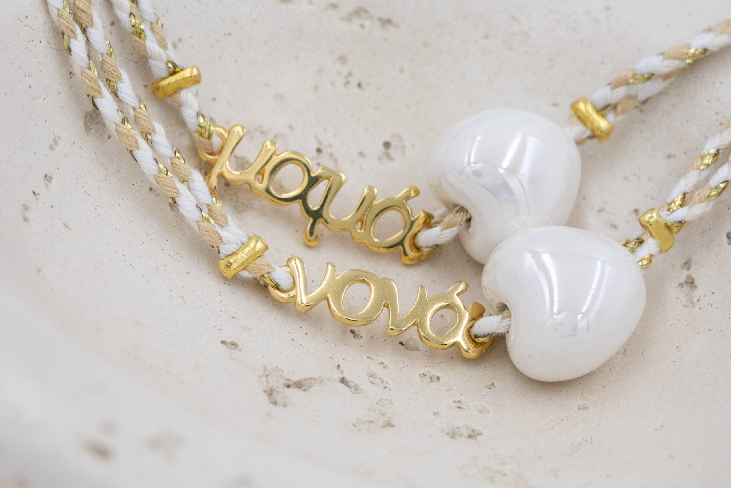 Βραχιόλι με λευκή καρδιά, επιχρυσωμένο μαμά, νονά και γιαγιά. Οι φωτογραφίες έχουν υποστεί επεξεργασία και τα χρώματα ίσως να διαφέρουν λίγο στην πραγματικότητα. Η Τιμή αφορά συσκευασία 2 τεμαχίων.